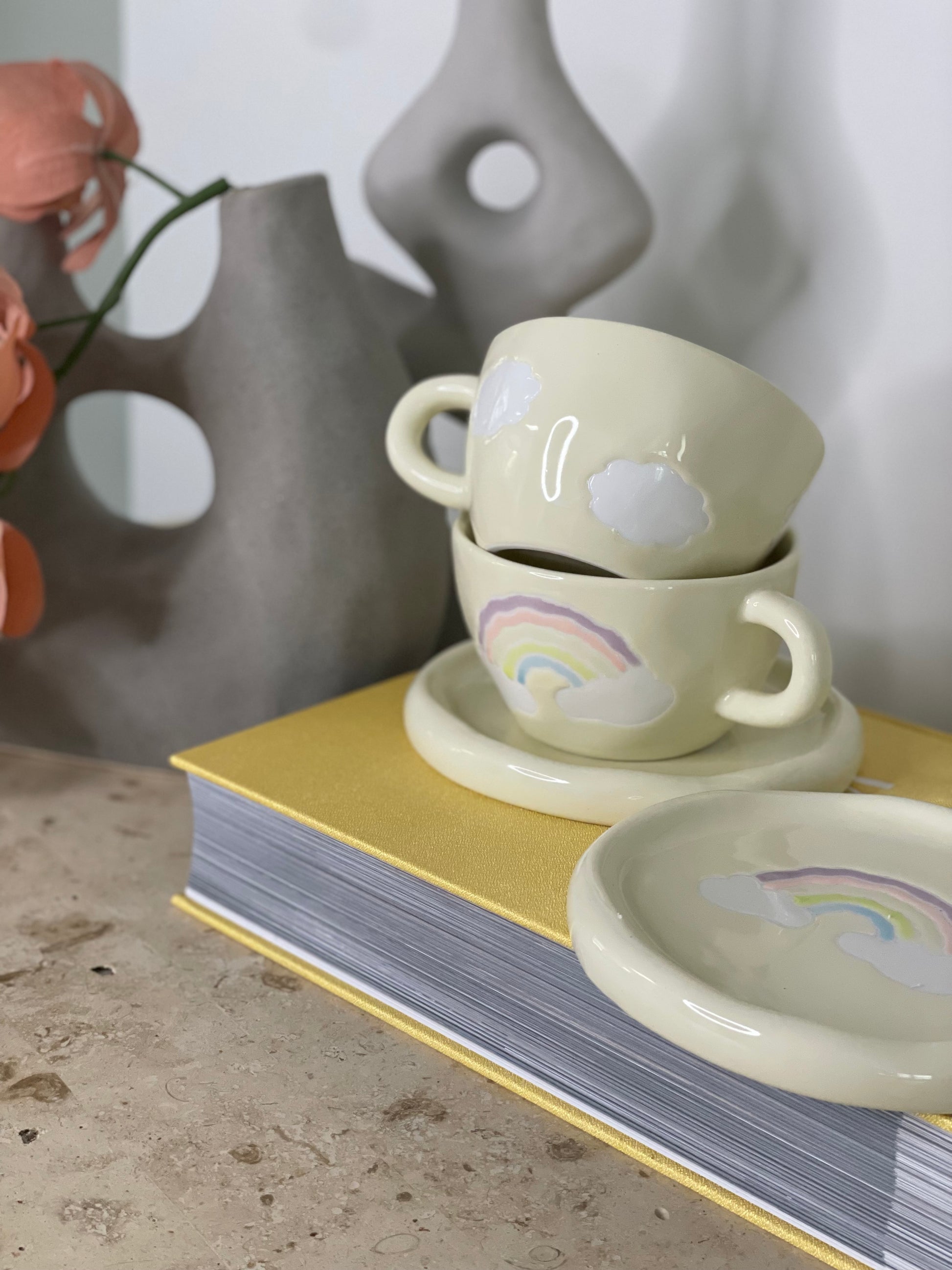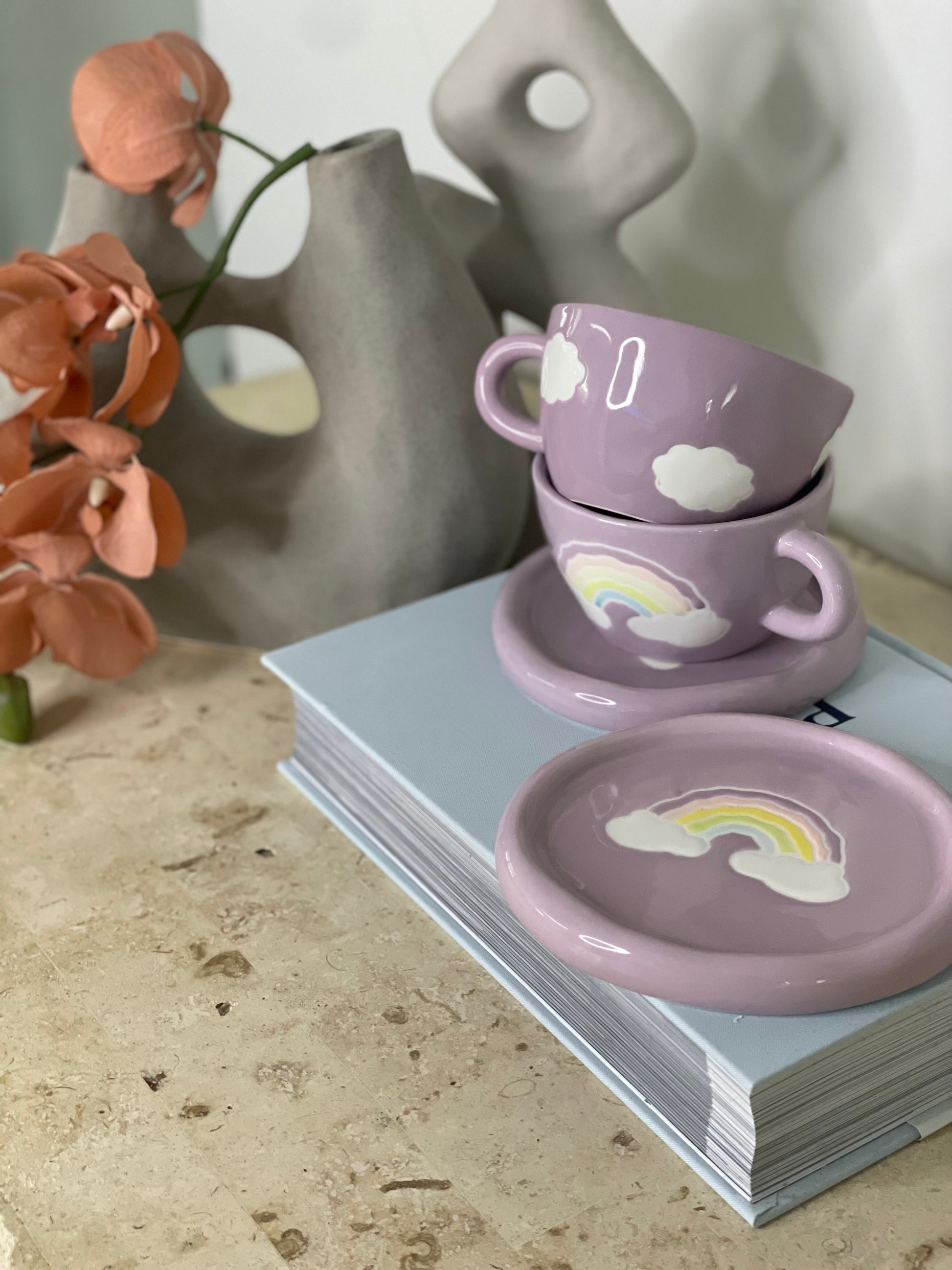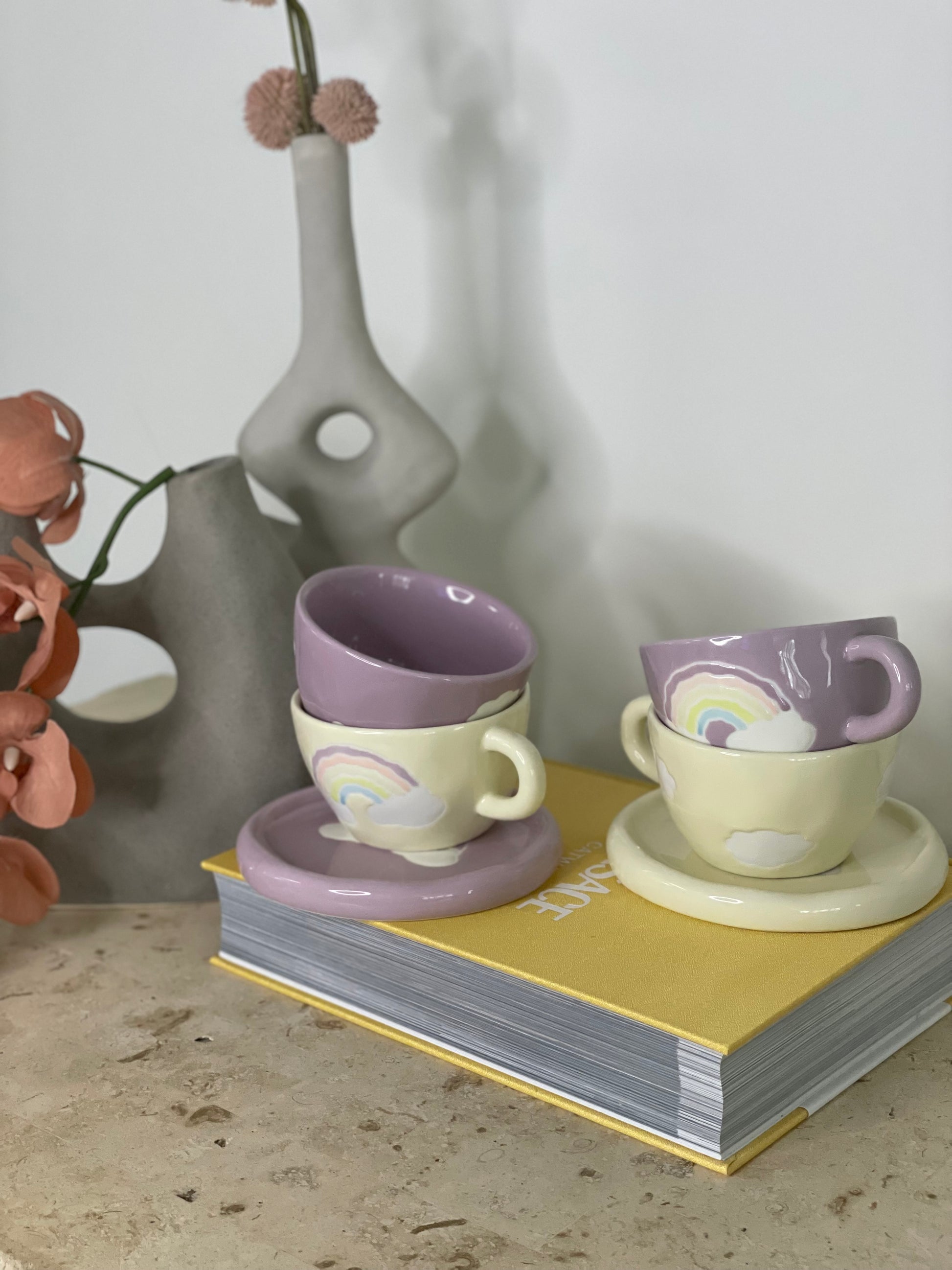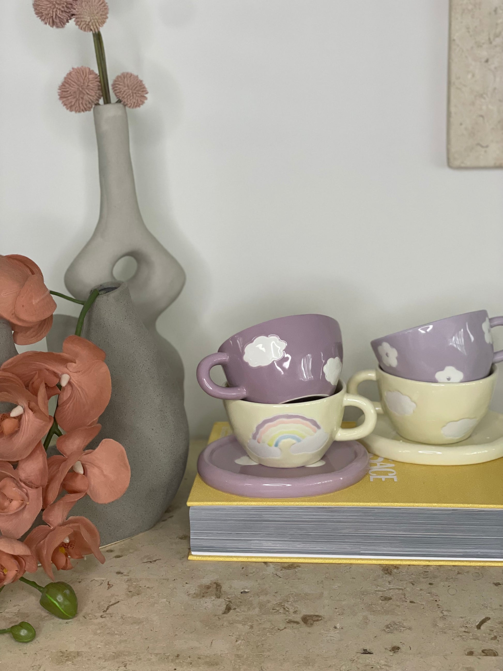 Elle brings out your inner child at the tea table. She takes you back to your childhood in the most enchanting way and makes every cup of tea feel like a fairytale. She features a double sided print of rainbows and clouds or a stunning floral print.