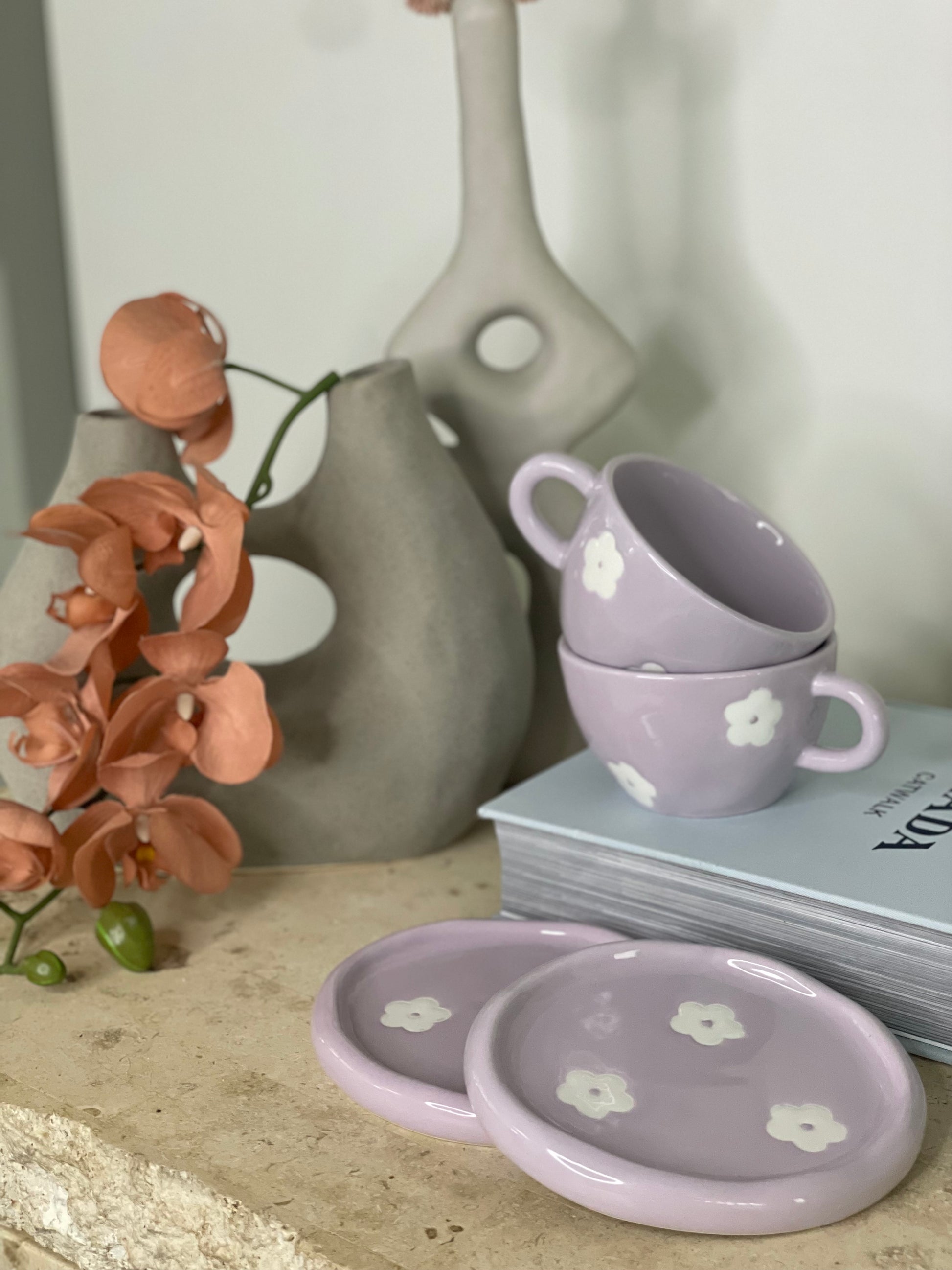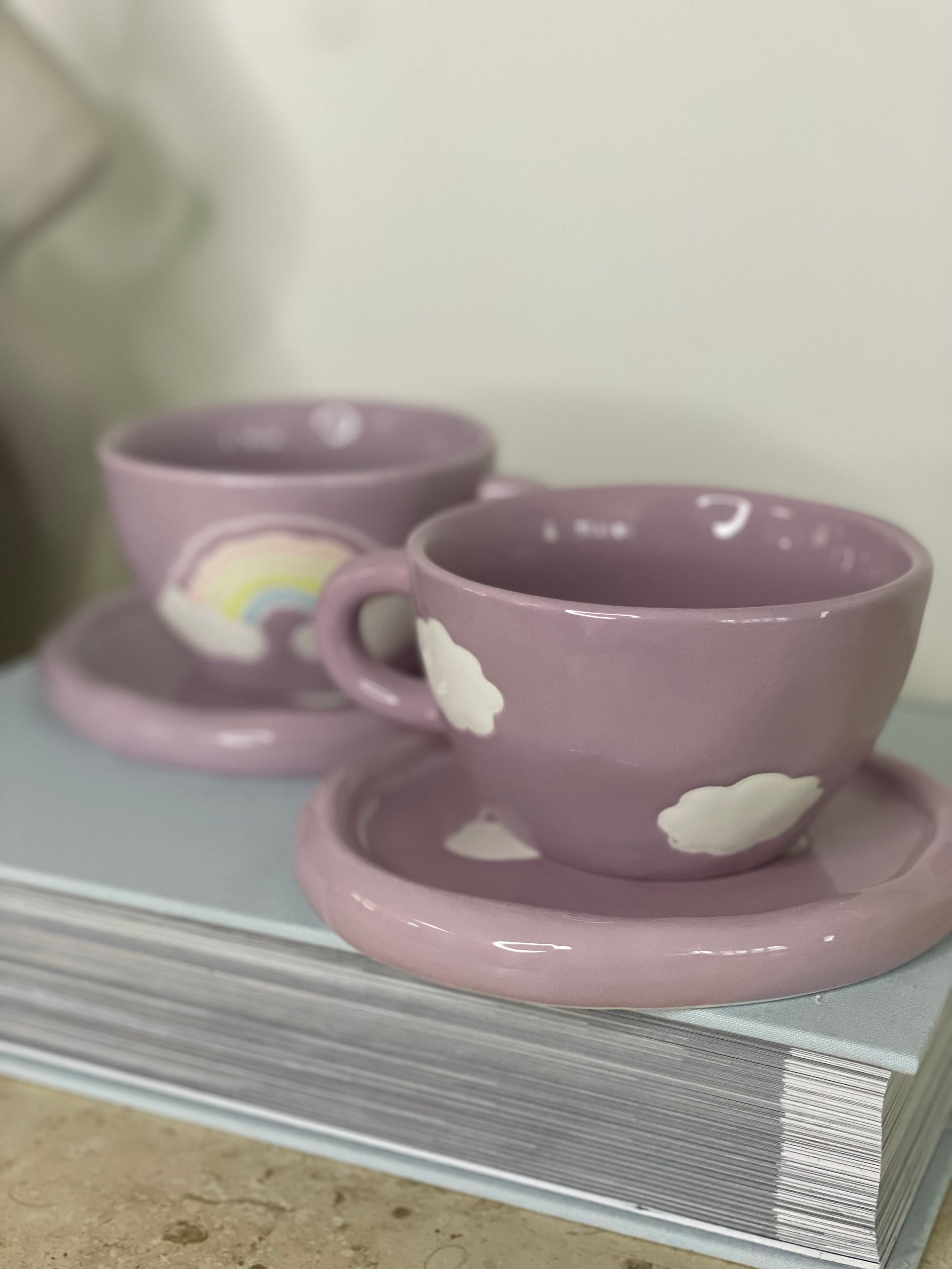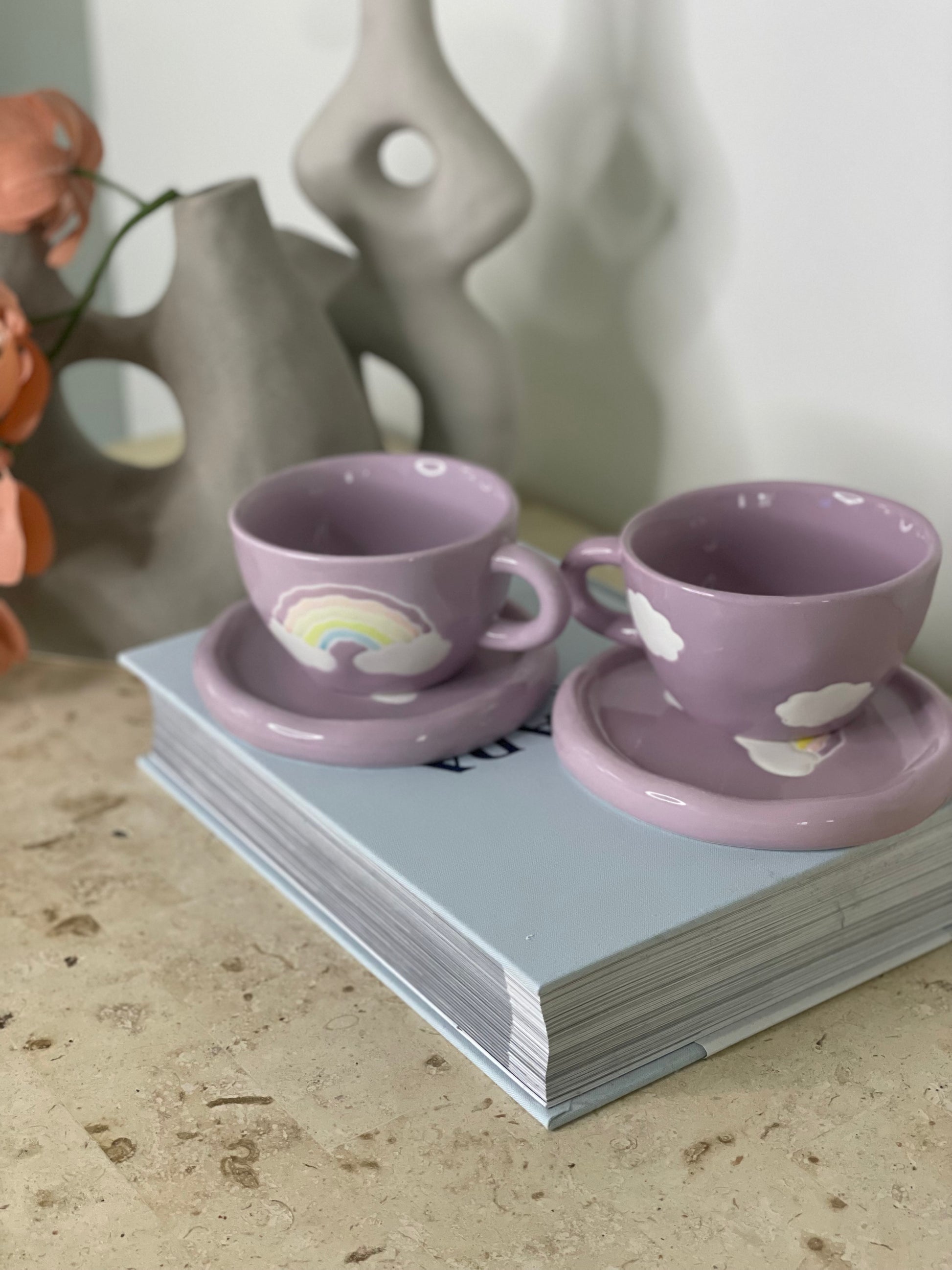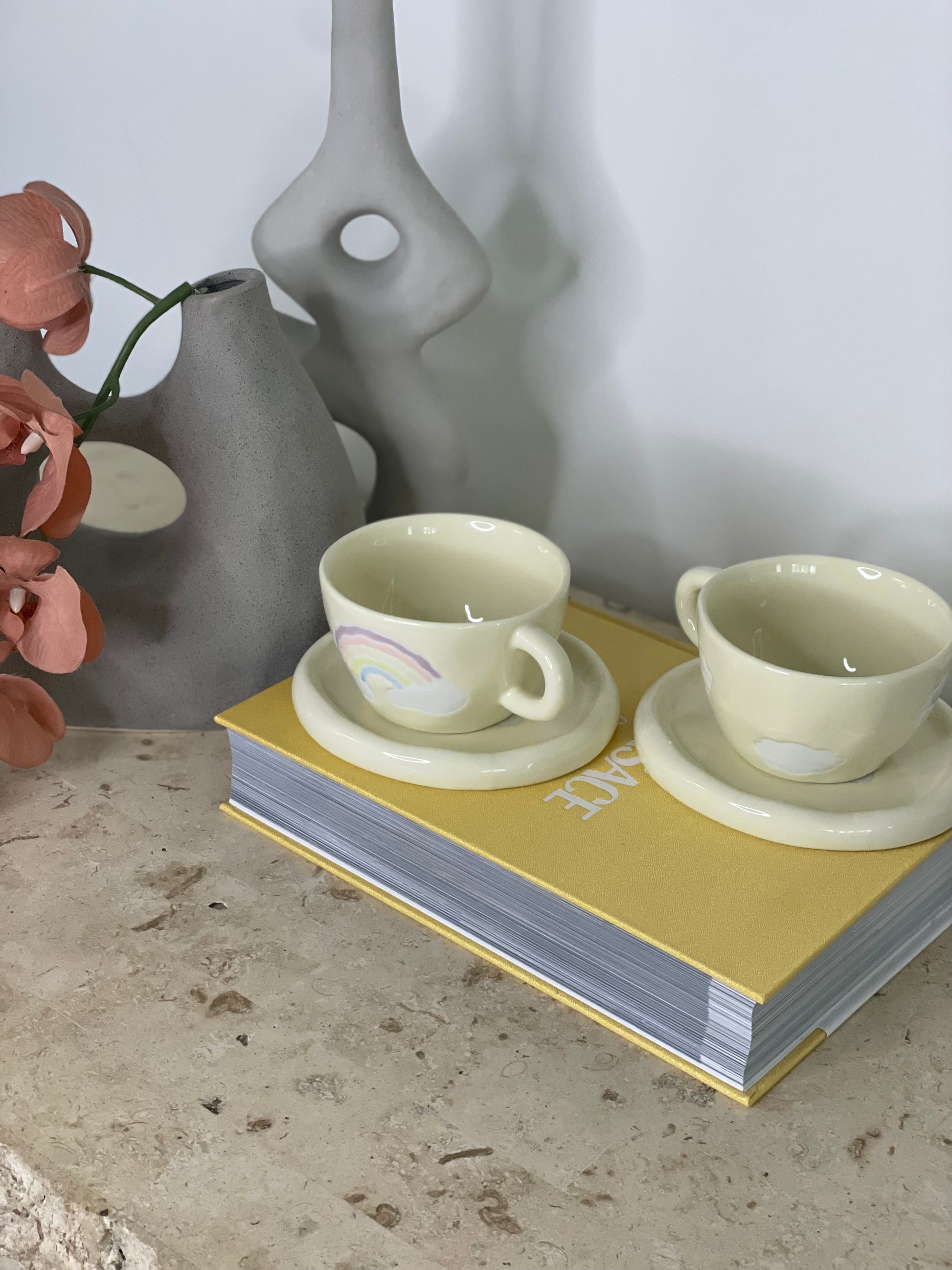 Elle brings out your inner child at the tea table. She takes you back to your childhood in the most enchanting way and makes every cup of tea feel like a fairytale. She features a double sided print of rainbows and clouds or a stunning floral print.